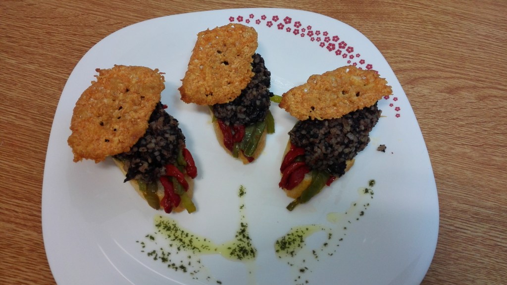 - Primero ponemos las verduritas en el pan tostado, después colocamos la morcilla, y por último nuestra teja de queso parmesano.